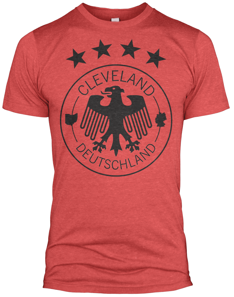 Your 4 star Cleveland German shirt is here! The Deutscher Fussball-Bund has won a fourth World Cup and I Love CLE has commemorated it Cleveland style. There is a rich German connection in Cleveland and this is the shirt to bring it all together. Simple, clean and strong this logo is silk screened in black on the finest tri-blend red shirt. Purchase while they are here! Printed in Cleveland proper as always.